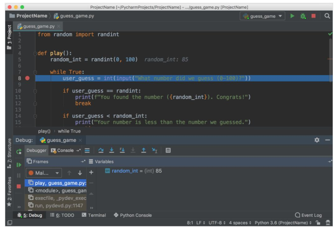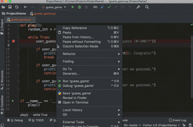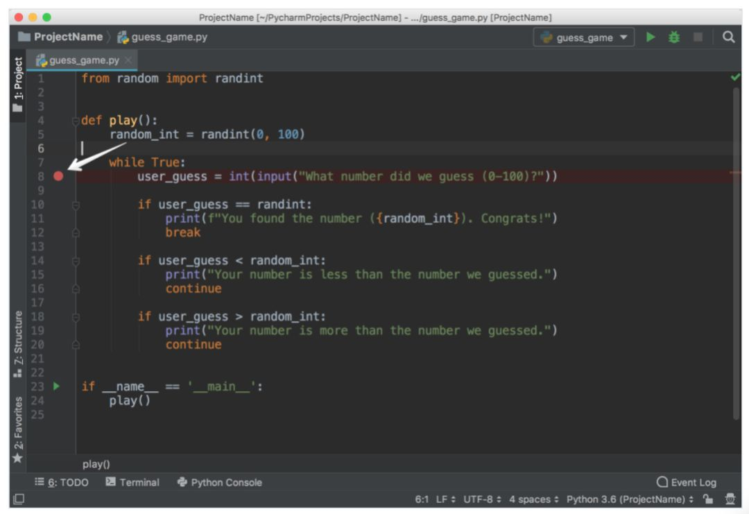 点击__main__句左侧的绿色小箭头,选择「Debug 『guess_game』」。