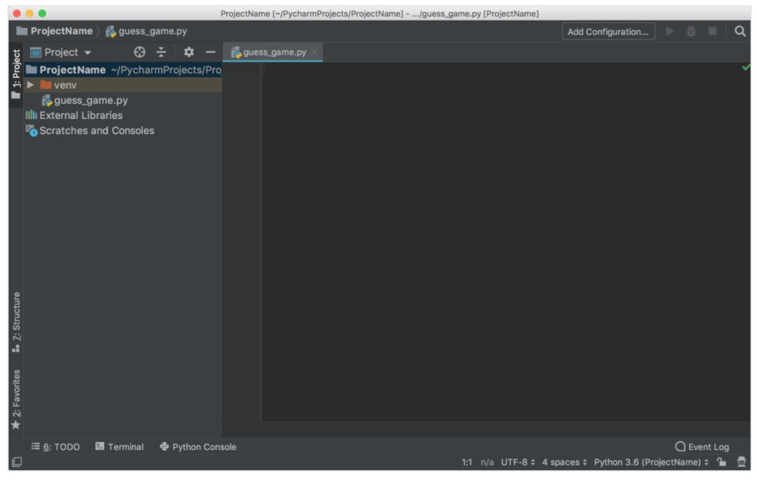 你也可以在菜单中选择 File → New。将新文件命名为 guess_game.py 并点击 OK。你将看到如下 PyCharm 窗口:
