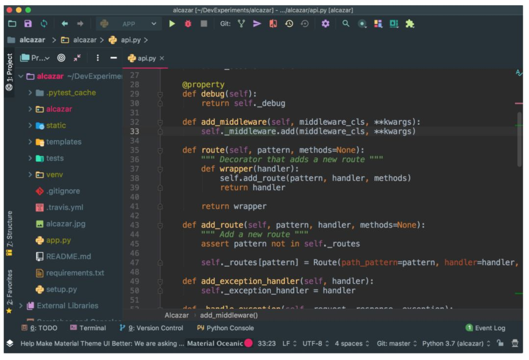 为了探索 PyCharm 以项目为中心的特征,你将使用 Alcazar web 框架(该框架用于学习目的)。