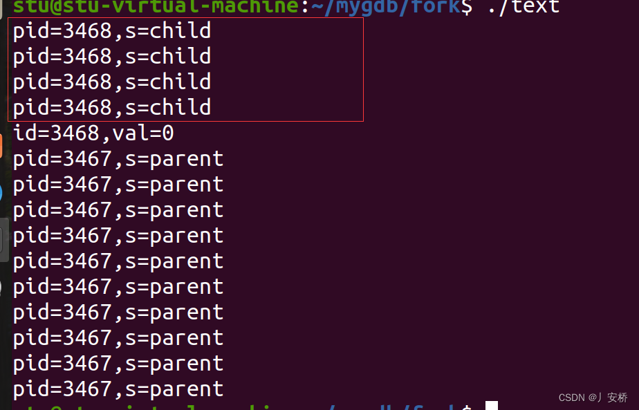 1 #include <stdio.h> 2 #include <stdlib.h> 3 #include <unistd.h> 4 #include <string.h> 5 #include <assert.h> 6 #include <sys/wait.h> 7 int main( int argc, char* argv[], char* envp[]) 8 { char * s = NULL; 9 int n = 0; 10 11 pid_t pid = fork(); 12 assert( pid != -1 ); 13 if ( pid == 0 ) 14 { 15 s = "child"; 16 n = 4; 17 } 18 else 19 { 20 s = "parent"; 21 n = 10; 22 23 int val = 0; 24 int id = wait(&val); 25 26 if ( WIFEXITED(val) ) 27 { 28 printf("id=%d,val=%d\n",id,WEXITSTATUS(val)); 29 } 30 } 31 int i = 0; 32 33 for(; i < n; i++ ) 34 { 35 printf("pid=%d,s=%s\n",getpid(),s); 36 sleep(1); 37 } 38 39 exit(0); 40 }