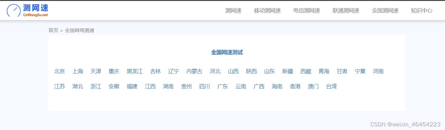 cewangsu.net还提供全国网速测试,支持全国各省份、城市的网络测速: