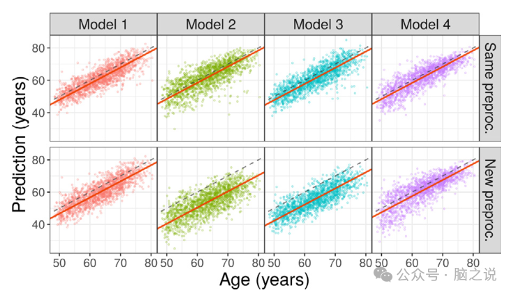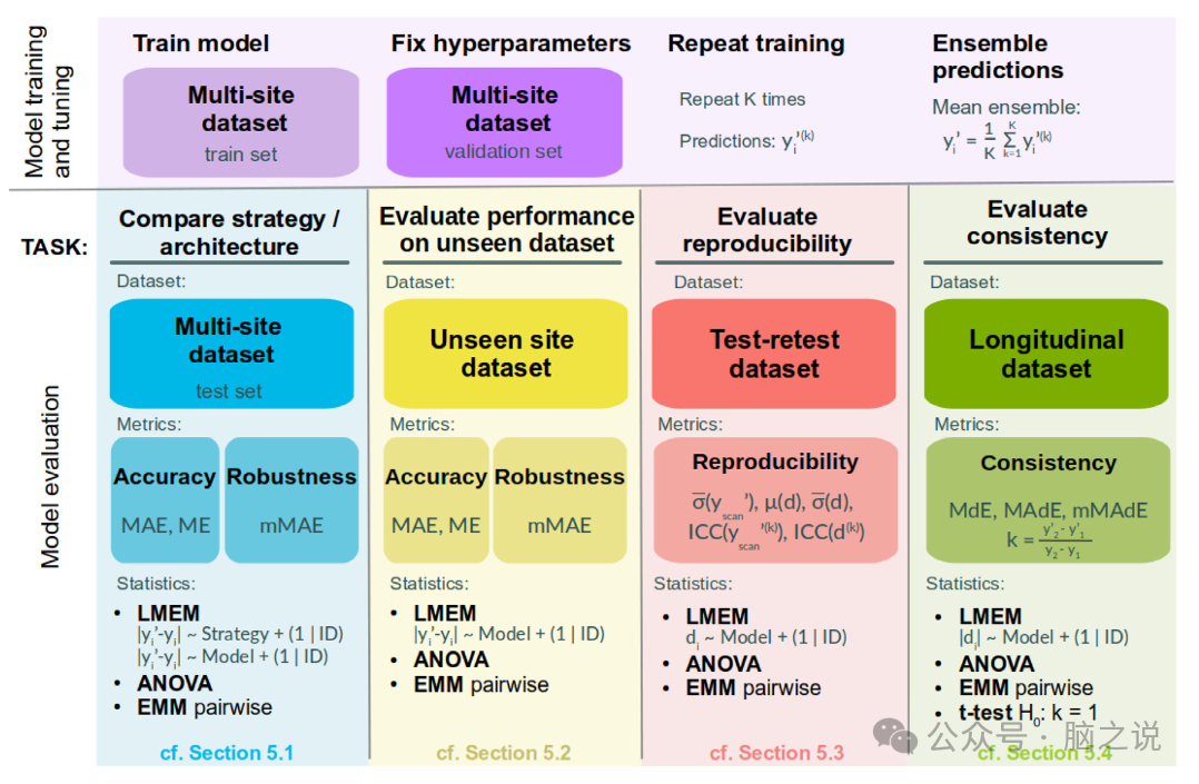 目前评估大脑年龄模型的方法主要集中在对比传统机器学习模型的性能上。在这些研究中。模型通常在同一组核磁共振成像上进行训练和测试。这样的评估可能无法完全捕获各种混杂因素,如受试者和扫描仪的可变性,从而忽略了模型性能的几个关键方面。尽管More et al.最近的综合研究深入了这些方面,但它主要关注传统的机器学习模型,从而忽略了深度学习模型固有的某些方面,例如用不同权值初始化训练的多个模型预测的可重复性,以及训练和测试数据集之间预处理中潜在变化的影响。