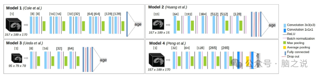 图3 脑年龄预测任务中四个重新实现的CNN模型的架构