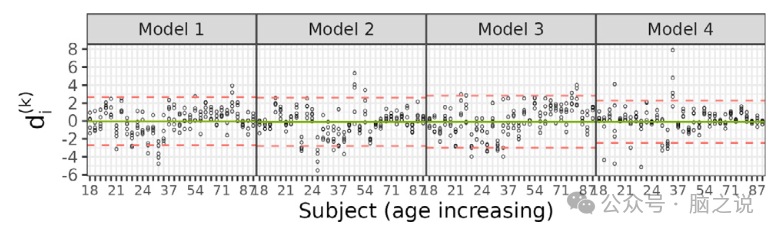 图6显示了每个受试者两次扫描之间的年龄预测差异。5个点中的每一个点表示具有5个不同权值初始化的模型。年龄预测的差异在受试者中保持一致,值接近于0。对于一些受试者,年龄预测差异达到4岁。值得注意的是,对于模型4,受试者内变异最小,这表明K=5种不同权重初始化的所有五个模型的年龄预测的大差异是一致的,因此,模型4的平均标准差最低。使用ICC计算5个模型之间预测差异的一致性,其中模型2达到了最高的一致性,其ICC为0.59。然而,结果显示所有4个模型的可靠性均为中等至较差。对于所有模型,每个单独Tlw扫描的ICC都非常出色,从模型3的0.95到模型1、2和4的0.98不等。我们推断,这种差异源于输入Tlw扫描的质量,特别是模型3的输入分辨率较低,并且模型通常具有良好的再现性。