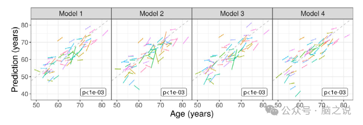 图7显示了大约60名随机选择的受试者的年龄轨迹,基于基线和随访之间的时间顺序和预测的大脑年龄,以及他们相应的来自UKB测试集的Tlw扫描。我们期望观察到斜率接近或等于身份线(图7中的虚线对角线)。对于模型2,特定受试者的年龄差异遵循相当随机的模式,而对于模型1和4,大多数特定受试者的线似乎与身份线平行。
