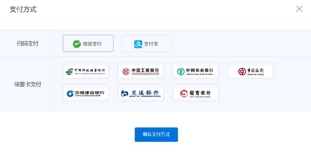 系统除支持微信及支付宝扫码支付外,还可支持相关储蓄卡支付,储蓄卡可支持银行后期将逐步开发,以支付页面显示为准;