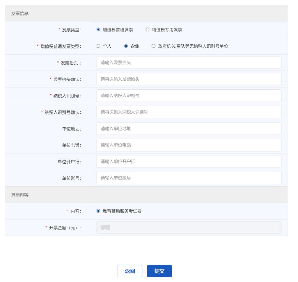 选择增值税普通发票的考生,需认真填写开票信息,后期将为考生开电子发票,开票后可通过系统下载电子发票;