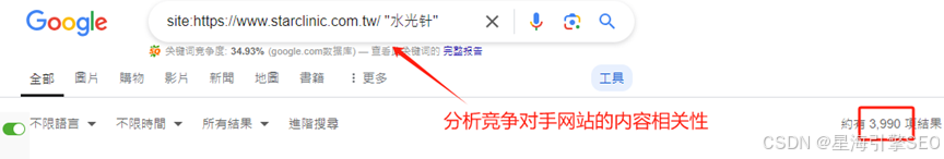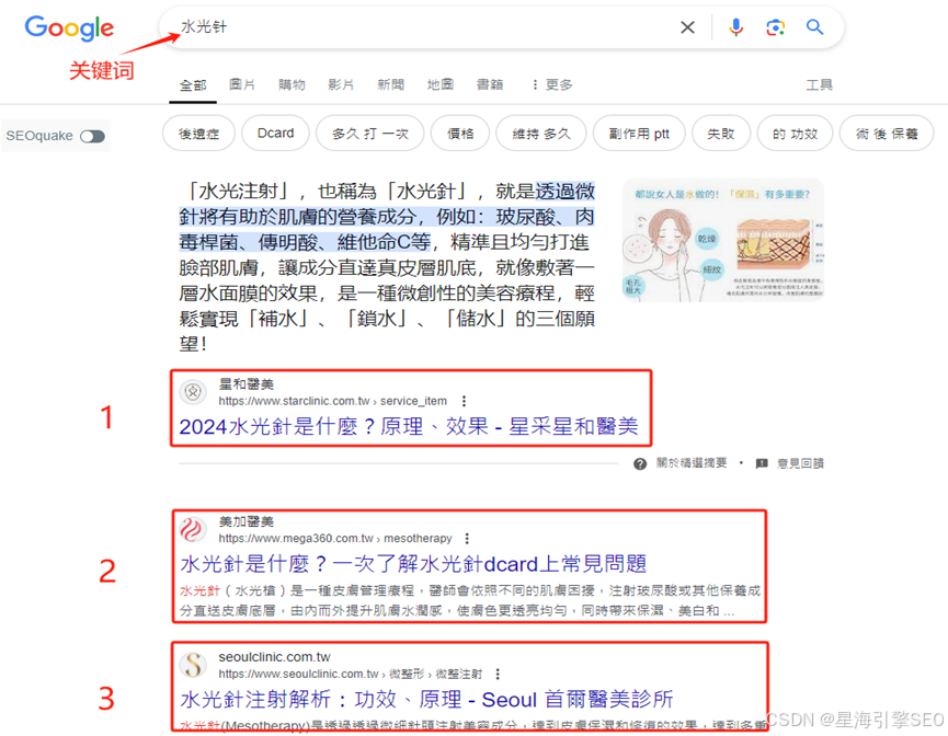 搜索引擎搜索:在Google等搜索引擎中输入与你业务相关的关键词,看看哪些网站排在前几名,这些基本上就是你的竞争对手。比如,你的网站是美容诊所,在google搜索引擎中搜索关键词“水光针”。出现在google首页的前10名就是你的竞争对手网站。
