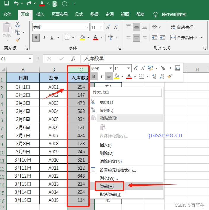 选中需要隐藏的行或列,比如图中所示的C列,然后点击鼠标右键,并在列表中选择“隐藏”即可;