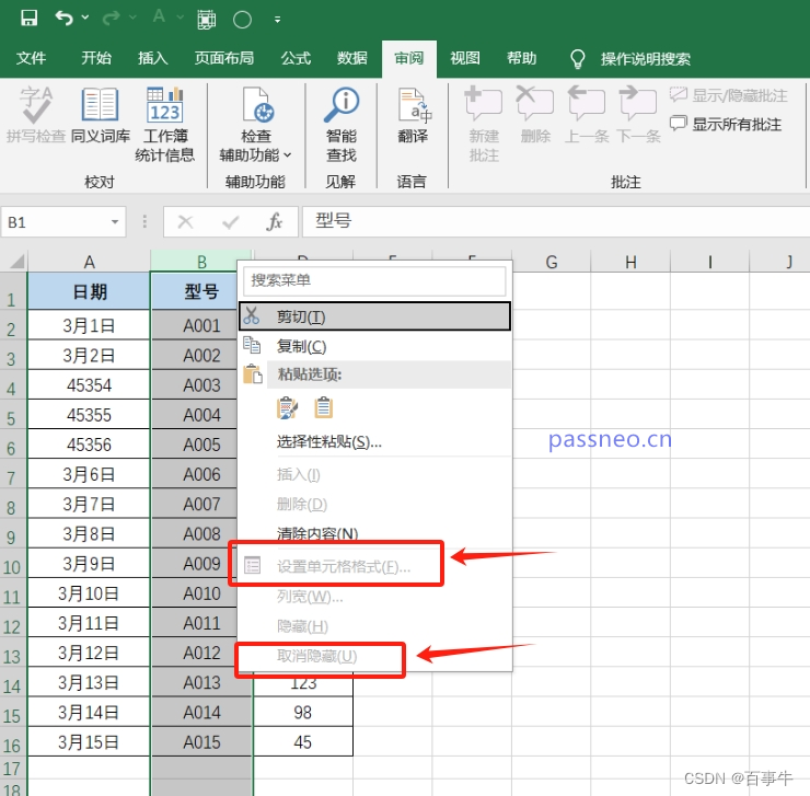 设置完成后,可以看到用来取消隐藏数据的相关选项,都变成灰色状态,无法点击,也就是无法取消隐藏了。