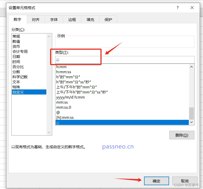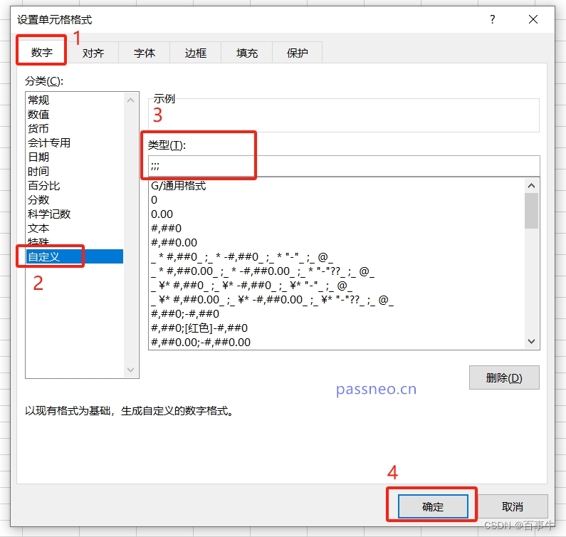 弹出对话框后,在“数字”选项卡中,选择“自定义”,再在“类型”框中,输入三个分号“;;;”,最后点击“确定”,就设置完成了。