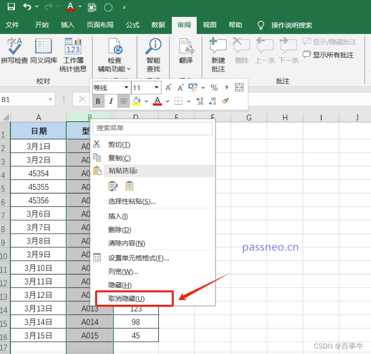 如果后续不需要隐藏了,只需要选中其中一列或一行,然后点击鼠标右键,在列表中选择“取消隐藏”即可。