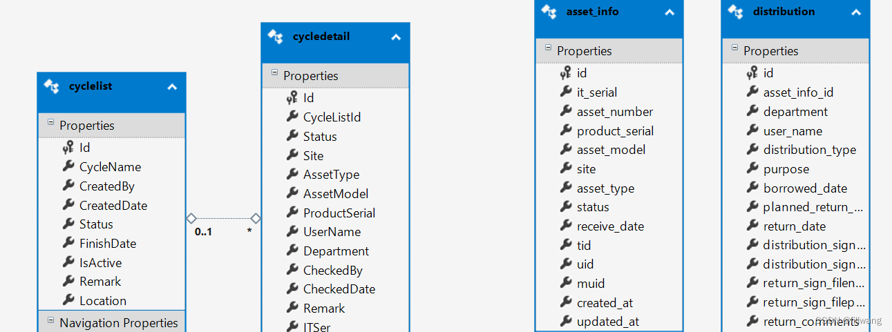 - 既然是database first,那么肯定要先建表了,在数据库中创建两个表,分别为cyclelist和cyclelistdetail,这两个表的关系为1对多,cyclelistdetail的外键是cyclelist的主键。下面就是Visual studio 方面的工作了。