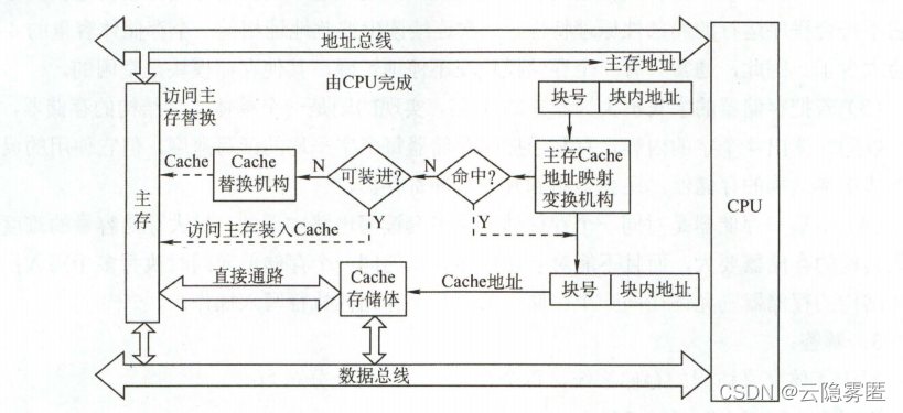 当CPU发出读请求时,如果访存地址在Cache中命中,就将此地址转换成Cache地址,直接对Cache进行读操作,与主存无关;如果Cache不命中,则仍需访问主存,并把此字所在的块一次从主存调入Cache内。若此时Cache已满,则需根据某种替换算法,用这个块替换掉Cache中原来的某块信息。值得注意的是,CPU与Cache之间的数据交换以字为单位,而Cache与主存之间的数据交换则是以Cache块为单位。