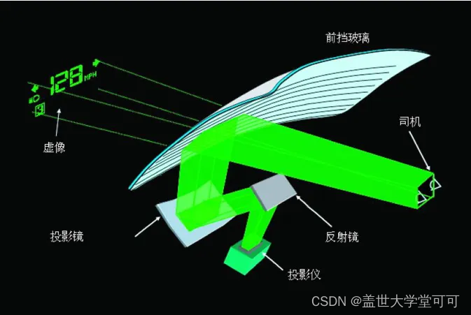汽车HUD 系统由投影单元和显示介质两大关键部件组成。投影单元内部集成了投影仪、反射镜、投影镜、调节电机及控制单元。其中,控制单元通过车辆数据总线获取车况、导航等信息,并通过投影仪输出图像。显示介质负责成像,成像载体主要是半透明树脂玻璃和汽车前挡风玻璃。