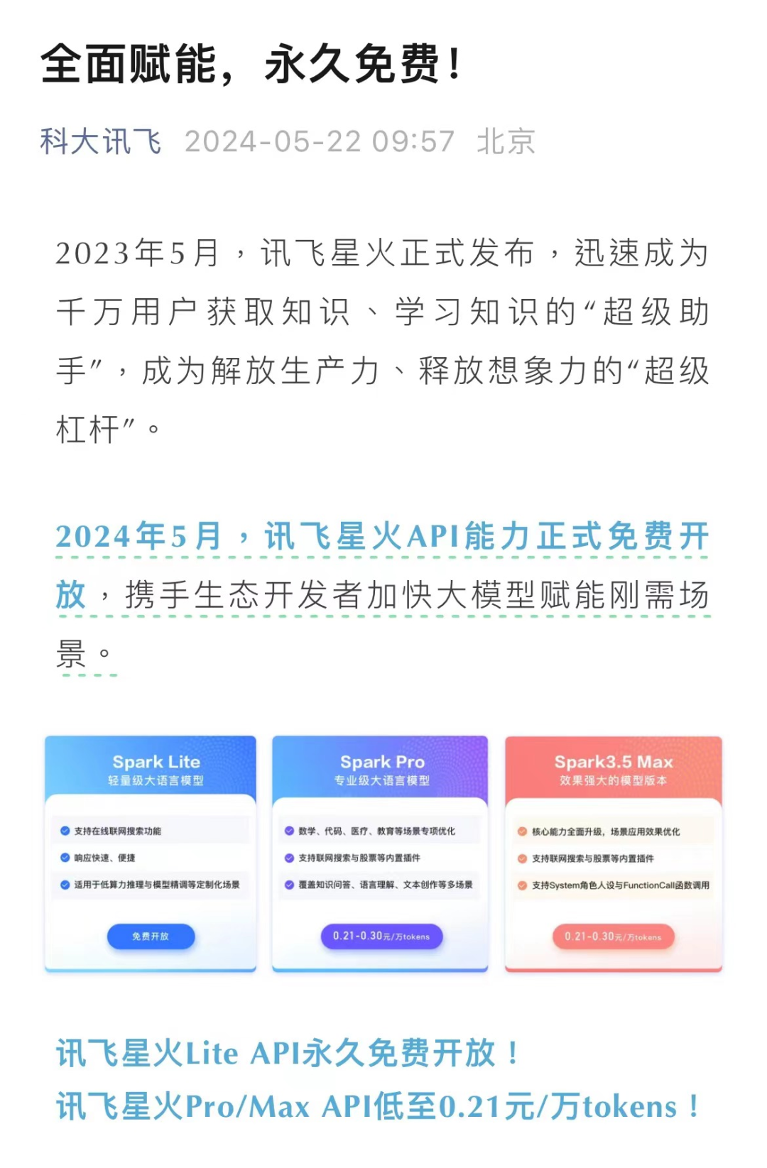 5月22日,科大讯飞宣布,讯飞星火API能力正式免费开放。其中,讯飞星火Lite API永久免费开放,讯飞星火顶配版(Spark3.5 Max)API价格低至0.21元/万tokens。目前,百度文心一言ERNIE-4.0和阿里通义千问Qwen-Max的定价为1.2元/万tokens。