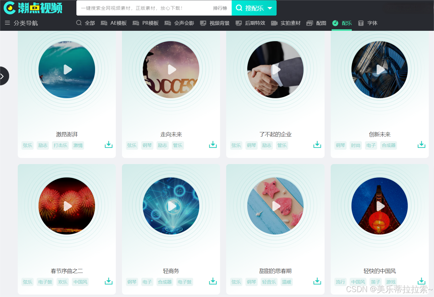 国外同样较为知名的一个音乐素材网站啦,按照不同主题进行了详细分类,所有音乐不仅品质非常高,也支持在线试听的操作,一些商业视频的配乐也可以找到,特别适合平时做企业号剪辑的同学。