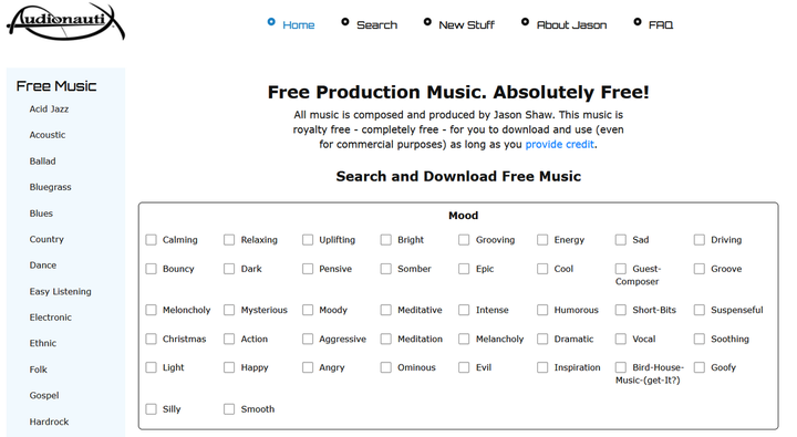 同样是不少剪辑师推荐过的一个音频素材站点,可以按照流行、电子、喜欢、蓝调和古典等类型进行分类筛选,也有各种心情的音频素材,目前站点已经停止更新,但是素材的总量非常多,全部可以免费下载。