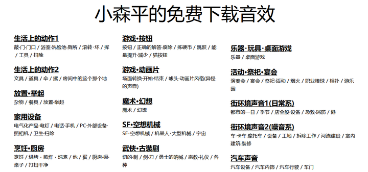 同样是站长自制的一些音效素材,可以免费用于各种公开渠道的自媒体,也有一些魔术、动画、汽车、活动、按钮和游戏相关的音频下载,主页的分类非常明确,各位同学根据自己的需要进行选择即可,以下截图只是其中一部分。