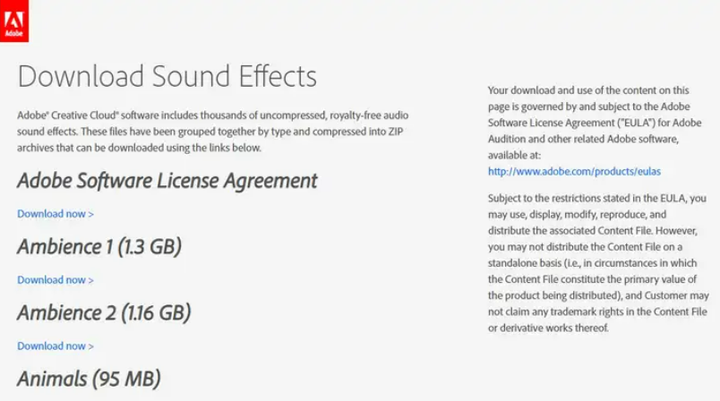 Adobe官方的音频素材下载站,而且有4位数的音效包,全部无版权可以商用,就是网站的打开素材比较慢,但是素材的种类和数量都非常多,直接一键即可保存到电脑上面!