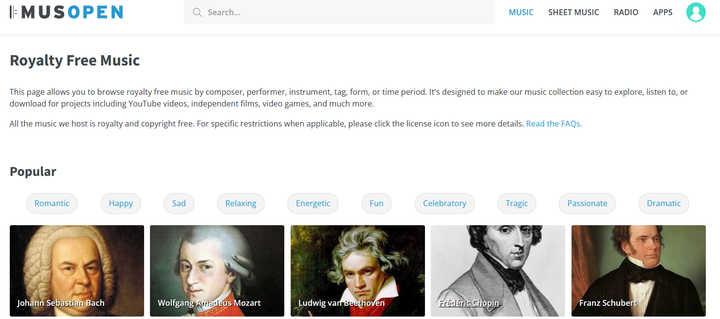 这个网站也有各种风格的免费音乐可供下载,例如搜索古典音乐后,就可以看到海量的免版权音频素材啦,并且可以通过时间长度和乐器等对于音频进行搜索,快速找到你想要的类型,身边不要不少剪辑师和音效师在使用。