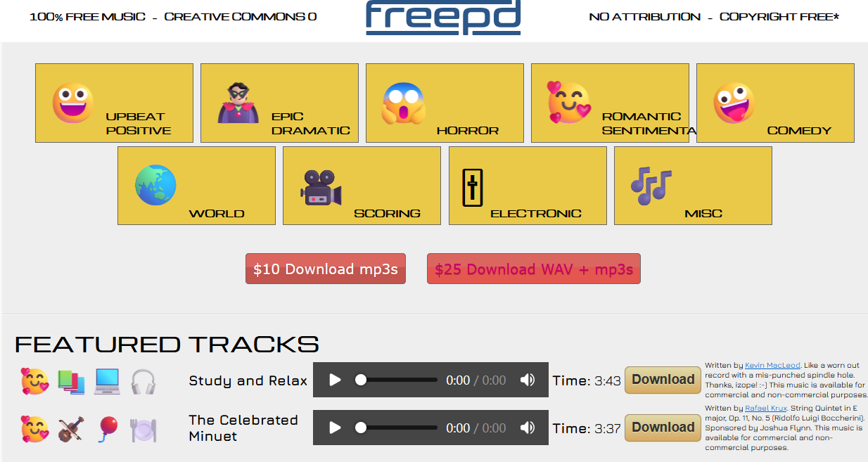 一打开网站,就可以看到“100% FREE”的字眼,说明这也是一个可以免费下载音频素材站点,也偶不少大佬推荐过啦,主要是以表情代表各种情绪的音乐,而且下载速度也是杠杠滴,非常适合作为一些生活类的视频配乐。