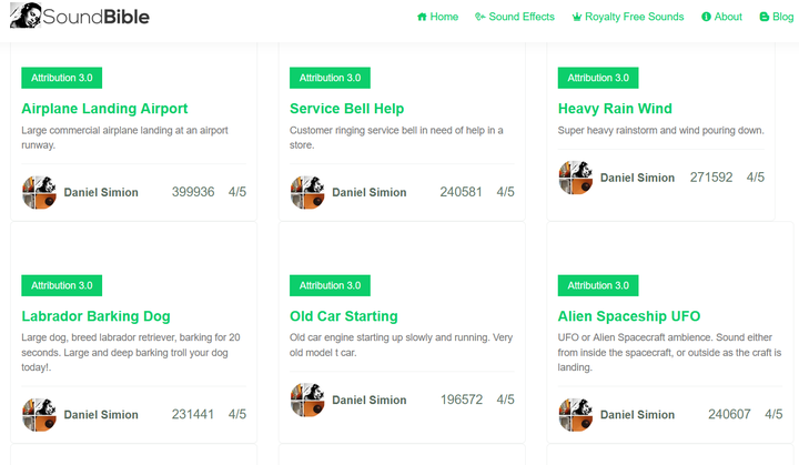 这也是一个可以下载各种免费音效的网站,包括自然、工业、动物、人类、交通和机器相关的音频都有,支持批量下载各种素材,网站的打开速度则比较一般,需要耐心等待,总能找到适合你的那一款!