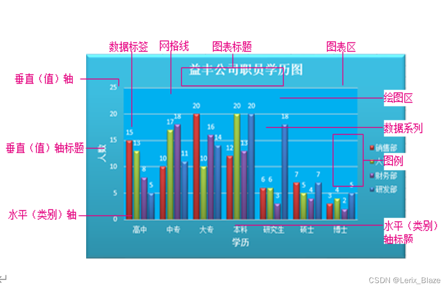 - 图表:利用Excel图表可以直观地反映工作表中的数据,方便用户进行数据的比较和预测。创建和编辑图表之前,首先需要认识图表的组成素(称为图表项)。以柱形图为例,它主要由图表区、标题、绘图区、坐标轴、图例、数据系列等组成