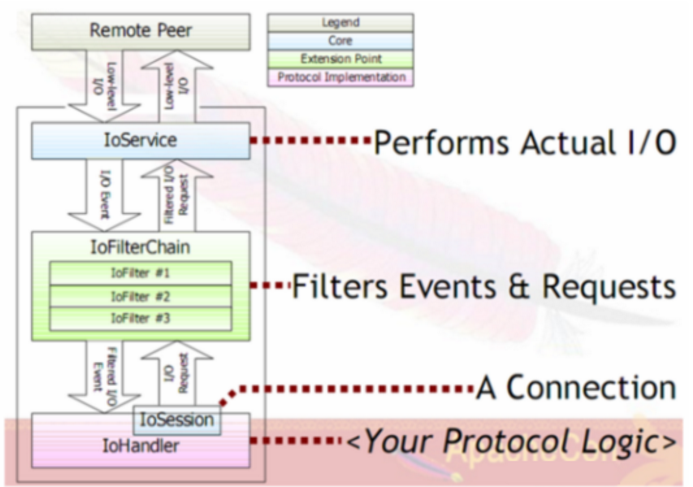 每当有数据到达时,IOService会先调用底层IO接口读取数据,封装成IoBuffer,之后以事件的形式通知上层代码,从而将Java NIO的同步IO接口转化成了异步IO。所以从图上看,进来的low-level IO经过IOService层后变成IO Event。