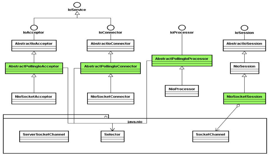 当然,如果你使用了Apache 的APR 库,那么你可以选择使AprSocketAcceptor 作为TCPServer 的实现,据传说Apache APR库的性能比JVM 自带的本地库高出很多。那么IoProcessor 是由指定的IoService 内部创建并调用的,我们并不需要关心。
