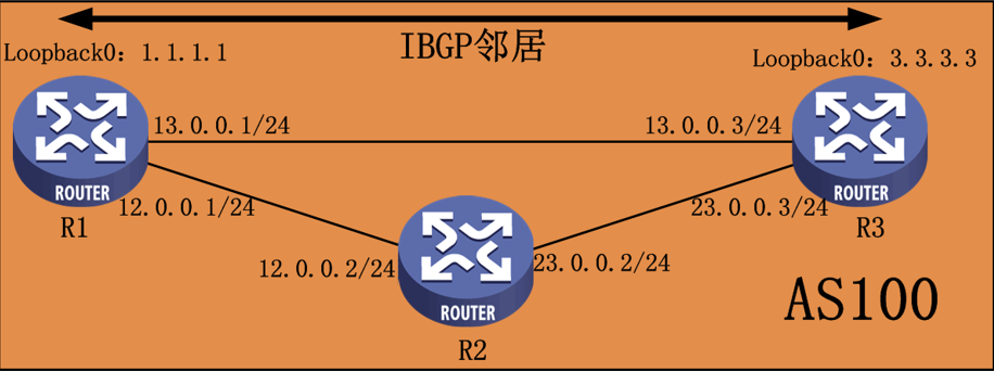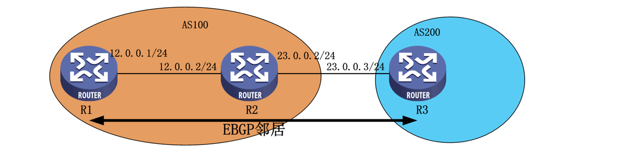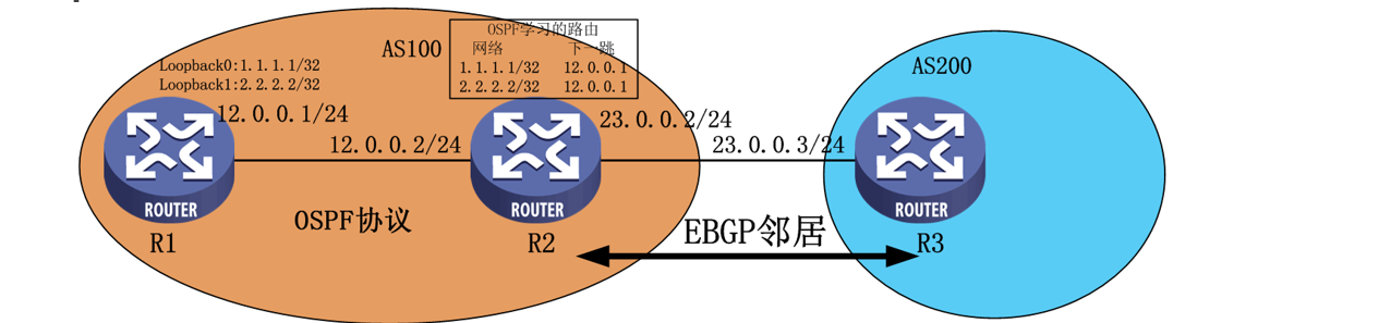 [R1]bgp 100 [R1-bgp]router-id 1.1.1.1 [R1-bgp]peer 10.0.12.2 as-number 200 [R1-bgp]peer 10.0.13.3 as-number 200 [R1-bgp]network 1.1.1.1 32 //通告网络1.1.1.1/32