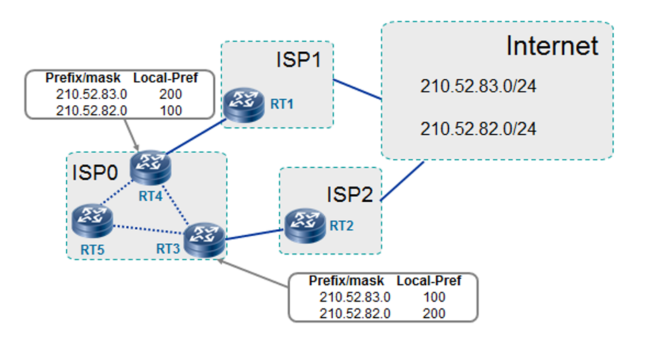 图中,互联网路由210.52.83.0/24和210.52.82.0/24分别通过ISP1和ISP2两个自治系统传到ISP0自治系统。配置RT4中210.52.83.0/24路由的Local-Pref属性为一个更高的值200,同理配置RT3中210.52.82.0/24路由的Local-Pref属性为一个更高的值200.如此一来,ISP0中的设备去往210.52.83.0/24将会走ISP1,去往210.52.82.0/24将会走ISP2。