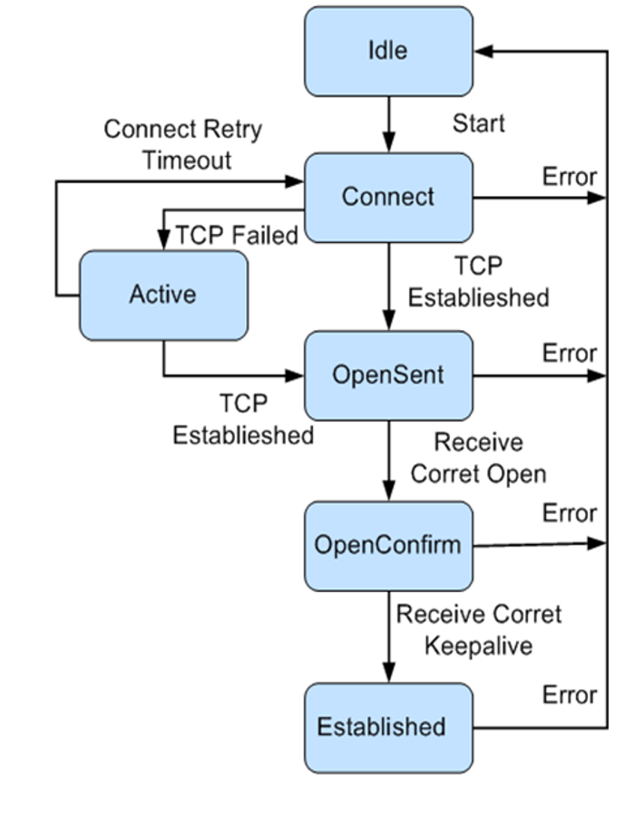 BGP状态机描述的是BGP邻居的建立过程,通过对这些不同状态的学习,可以更加深入地了解BGP的工作原理,以及排查思路。BGP状态机公有六种状态,如图: