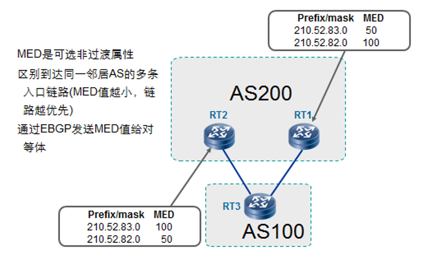 如图:AS200中将两条路由(210.52.83.0和210.52.82.0 )通告给AS100.其中RT1在通告是将210.52.83.0设置一个比较小的MED属性(50),RT2在通告时将210.52.82.0设置一个比较小的MED属性(50)。AS100收到这些通告后,会认为到达210.52.82.0通告RT2的路径是最优的,而到达210.52.83.0通告RT1的路径是最优的。