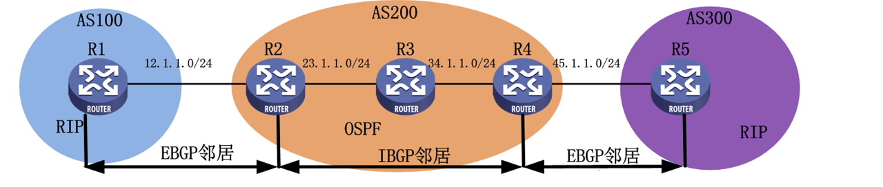 在R1和R2、R1和R3配置EBGP邻居关系,使R1、R2和R3之间可以通过EBGP相互传递路由。在R2、R3和R4上配置IBGP邻居关系,使R2、R3和R4之间通过IBGP互相传递路由。
