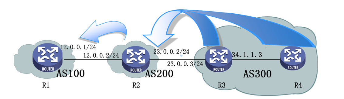 [R2]bgp 200 //进入bgp视图,其中本端AS号为200 [R2-bgp]router-id 2.2.2.2 //配置BGP的router-id [R2-bgp]peer 12.1.1.1 as-number 100 //和12.1.1.1建立EBGP邻居关系 [R2-bgp]peer 34.1.1.4 as-number 200 //和34.1.1.4建立IBGP邻居关系