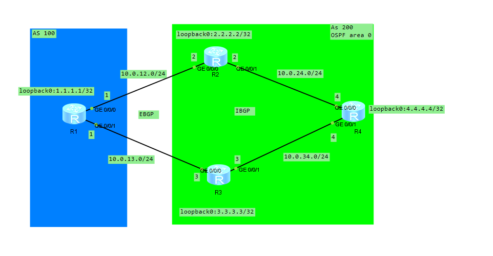 [R4]bgp 200 [R4-bgp]router-id 4.4.4.4 [R4-bgp]peer 10.0.24.2 as-number 200 [R4-bgp]peer 10.0.34.3 as-number 200 [R4-bgp]network 4.4.4.4 32