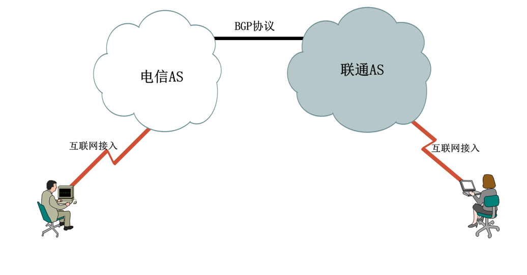 BGP解决的是自治系统之间的路由学习问题。当今互联网是全球互联,在中国,互联网运营商有电信和联通。每个公司都有自己的自治系统,并且内部运行IGP协议。但是互联网又要求互联,所以通过BGP就可以在电信和联通之间的学习路由,是电信的用户可以和联通的用户之间上网聊天,发送邮件等。如图: