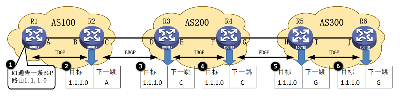 图中A~J对应每个路由器的接口的IP地址。R1通过一条BGP路由1.1.1.0,首先R2收到,因为R1和R2是邻居,而且该路由器始发于本自治系统(AS100),所以在通告给R2时下一跳为A。R2继续通告给R3,因为R2和R3是EBGP邻居,所以通告给R3时下一跳为C。R3继续通告给R4,因为R3和R4是IBGP邻居,而且该路由不是始发于本自治系统(AS200),而是由其他自治系统学习而来的,所以R3通告给R4时,下一跳不变,依然为C,同理,R5和R6的下一跳为G。