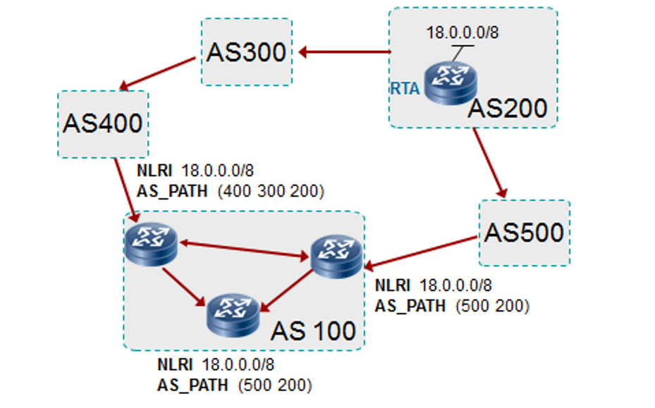 如图:AS200中的路由器RTA通告了一条路由18.0.0.0/8。该路由分别通过(200→300→400→100)和(200→500→100)传递到AS100中。AS100在收到的路由中会携带该路由传播路径中的所有AS列表,其中最近的放在前面。