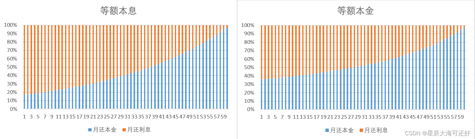 以下是月还本息的绝对数形态:等额本息月还本金递增,等额本金月还本金不变