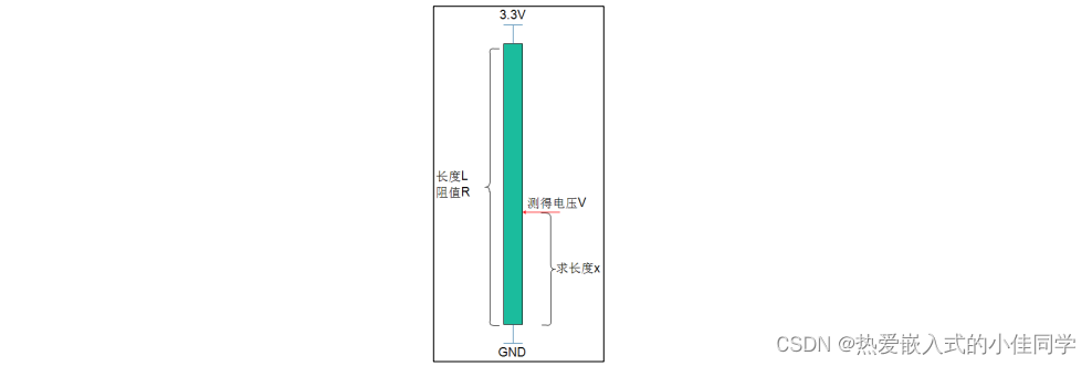 图中的电阻假设是均匀的,就是长度和阻值成正比关系。电阻长度为 L,阻值为 R,在两端施加 3.3V 电压。在某点测得电阻为 V,求上图中长度 X。 根据欧姆定律:3.3/R = V/Rx,