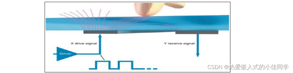 电容屏中有一个控制芯片,它会周期性产生驱动信号,接收电极接收到信号, 并可测量电荷大小。当电容屏被按下时,相当于引入了新的电容,从而影响了接 收电极接收到的电荷大小。主控芯片根据电荷大小即可计算出触点位置。