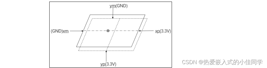 在 xp、xm 两端施加 3.3V 电压,yp 和 ym 不施加电压(yp 就相当于探针), 测量 yp 电压值。该电压值就跟 X 坐标成正比关系,假设: X = 3.3*Vyp/Xmax
