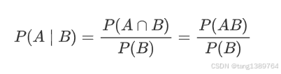 设Ω为样本空间, A和 B 是两个事件,且 P(B)>0。事件 A 在事件 B 发生的条件下的条件概率 P(A∣B) 定义为: