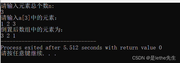 #include"stdio.h" int main(){ int n,i; printf("请输入总素个数n:\n"); scanf("%d",&n); int a[n];//定义变长数组a[n] printf("请输入a[%d]中的素:\n",n); //素输入 for(i=0;i<n;i++){ scanf("%d",&a[i]); } int j,temp;//定义中间变量temp i=0;//i表示首素下标 j=n-1;//j表示末尾素下标 //功能函数:交换n/2次,每次都把头尾素交换 while(i<j){ temp=a[i]; a[i]=a[j]; a[j]=temp; i++; j--; } printf("素倒置后:\n"); //素输出 for(i=0;i<n;i++){ printf("%d ",a[i]); } return 0; }
