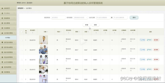 管理员出诊医生管理。在出诊医生页面输入医生姓名,选择挂号类型和出诊日期进行查询,新增或删除出诊医生列表,并根据需要对出诊医生详情信息进行详情,修改或删除操作;如图5-10所示: