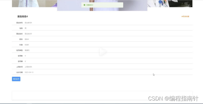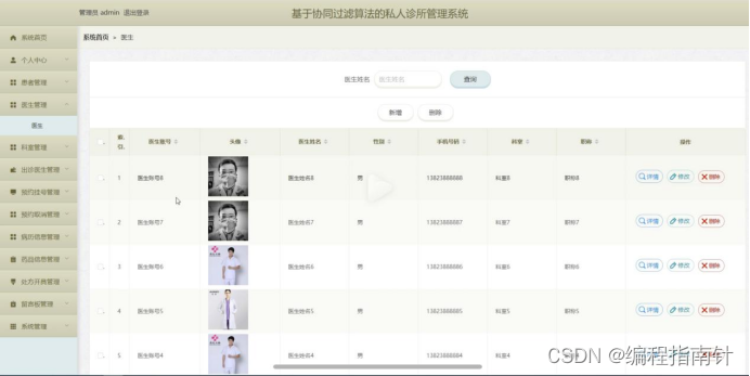 管理员医生管理。在医生页面输入医生姓名进行查询,新增或删除医生列表,并根据需要对医生详情信息进行详情,修改或删除操作;如图5-9所示: