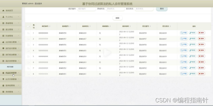 管理员病历信息管理。在病历信息页面输入病历编号,患者姓名和医生姓名进行查询或删除病历信息列表,并根据需要对病历详细信息进行详情,修改或删除操作,如图5-11所示: