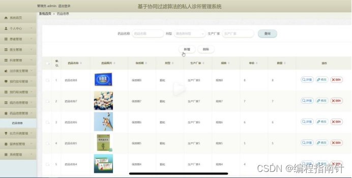 管理员药品信息管理。在药品信息页面输入药品名称,选择剂型和生产厂家进行查询,新增或删除药品信息列表,并根据需要对药品详细信息进行详情,修改或删除操作,如图5-12所示: